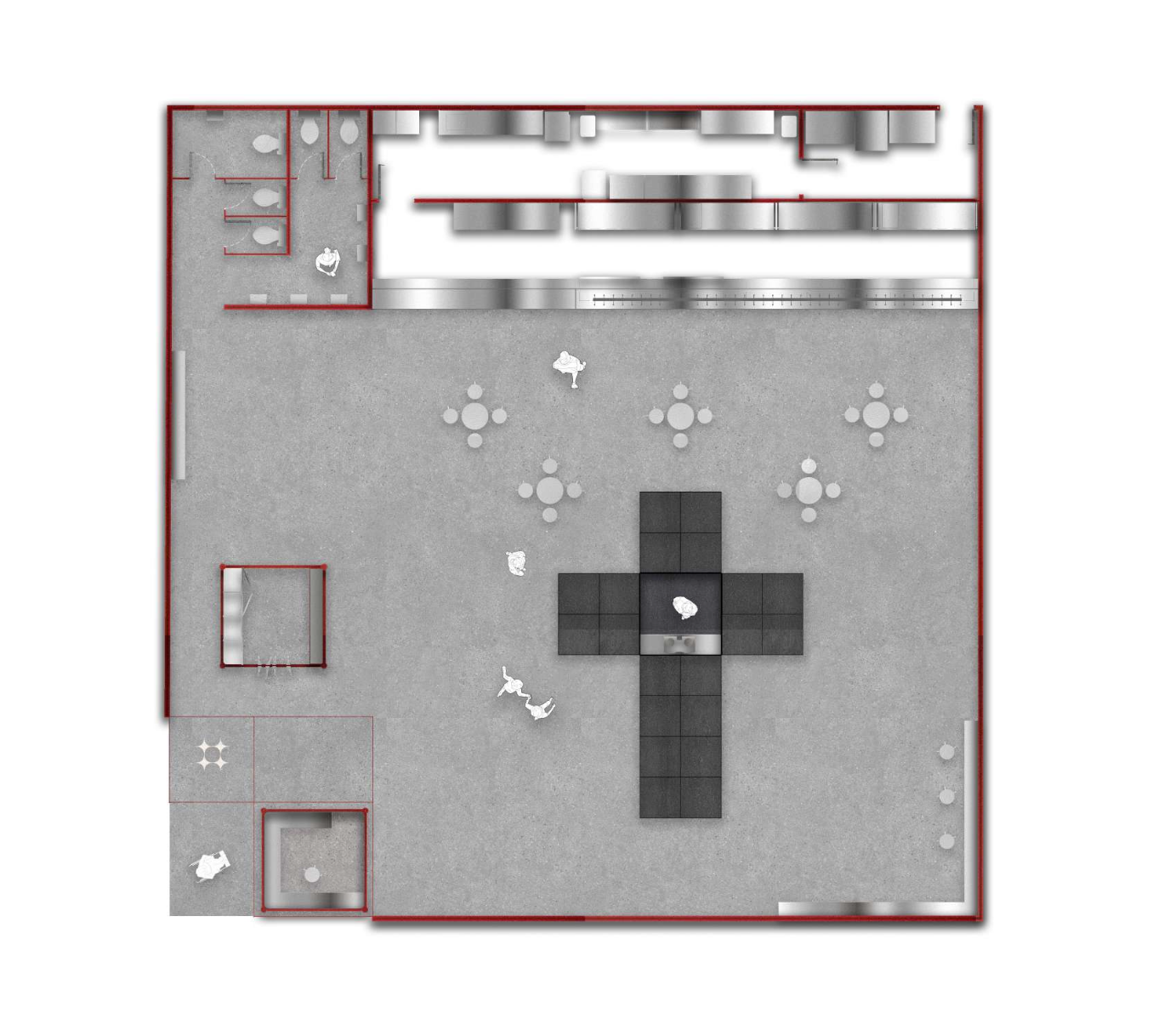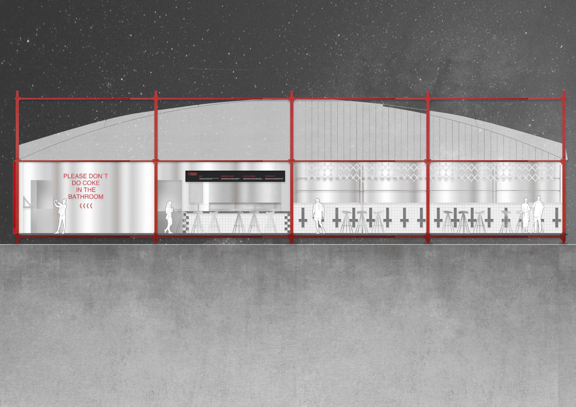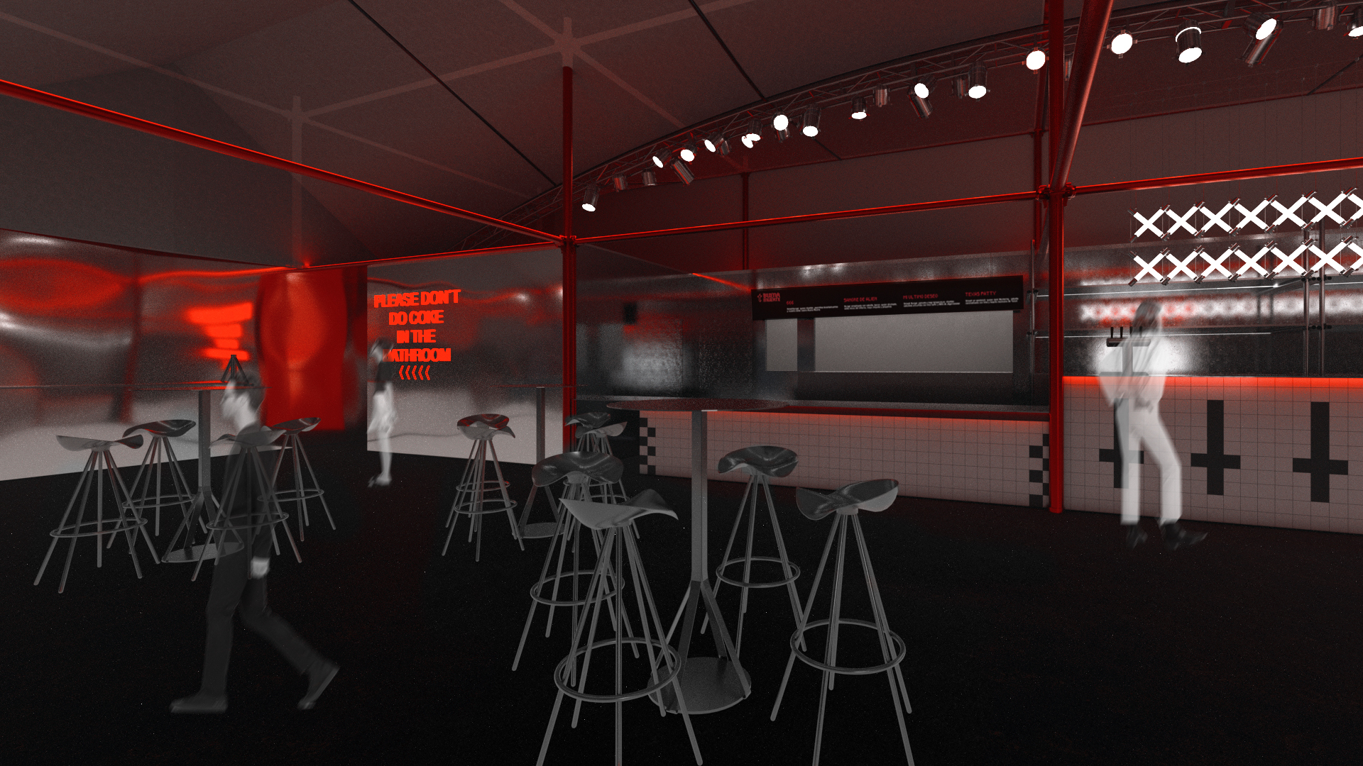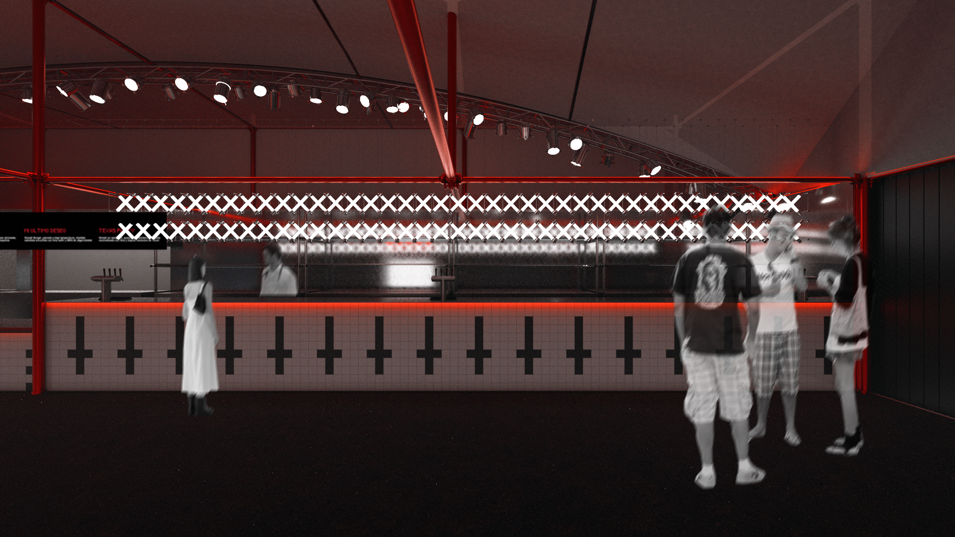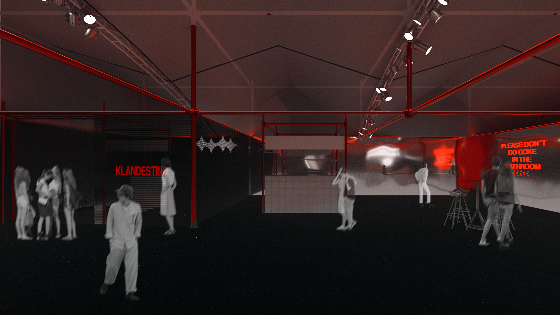 Klandestino is a conceptual fusion between techno culture and Andalusian tradition, inspired by the contrast between day and night, flamenco and electronic music, the visible and the hidden. The project reinterprets the idea of the traditional caseta through an industrial aesthetic — me- tal structures, red and black tones, and LED lighting — evoking the energy of the underground club scene while keeping the festive spirit of the Granada Fair.